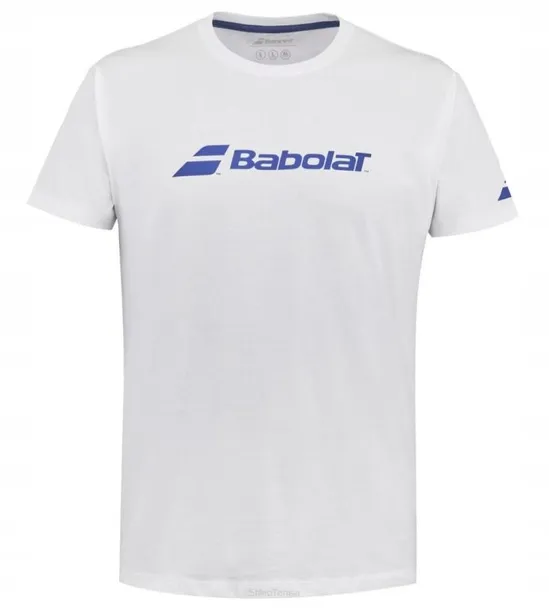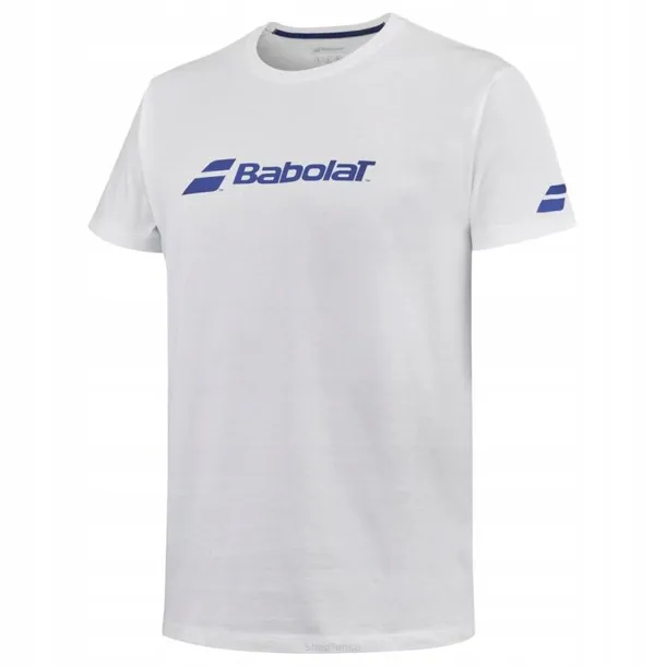 Design i Kolorystyka: Koszulka charakteryzuje się czystym, ponadczasowym stylem w kolorze białym (White). Centralnym elementem jest duże, poziome logo Babolat w kontrastowym kolorze niebieskim, umieszczone na klatce piersiowej. Wewnętrzne obszycie przy dekolcie, a także mały detal na rękawie, są zaznaczone tym samym niebieskim kolorem, co nadaje całości sportowego charakteru.